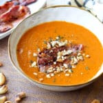 bouillon de légumes, carottes, concentré de tomates, coriandre, cumin, lard, laurier, lentilles corail, noix de cajou, oignon, tomates concassées, yaourt