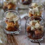 Dans chaque verrines, disposer de la préparation à base de poires, quelques petits morceaux de pain d'épices émietté puis terminer par quelques dès de foie gras.