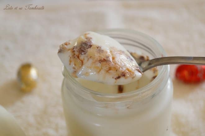 Parsemer de quelques pépites de pralin puis verser le mélange de yaourt sucre et lait dessus.