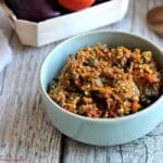 Une fois le mélange bien réduit, ajouter les dés d’aubergines et laisser mijoter 10 à 15 minutes en écrasant le tout avec une fourchette.